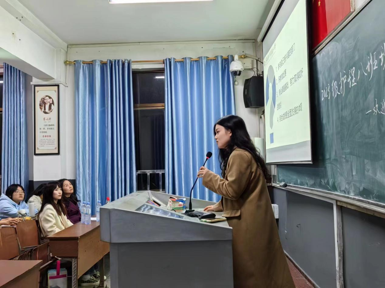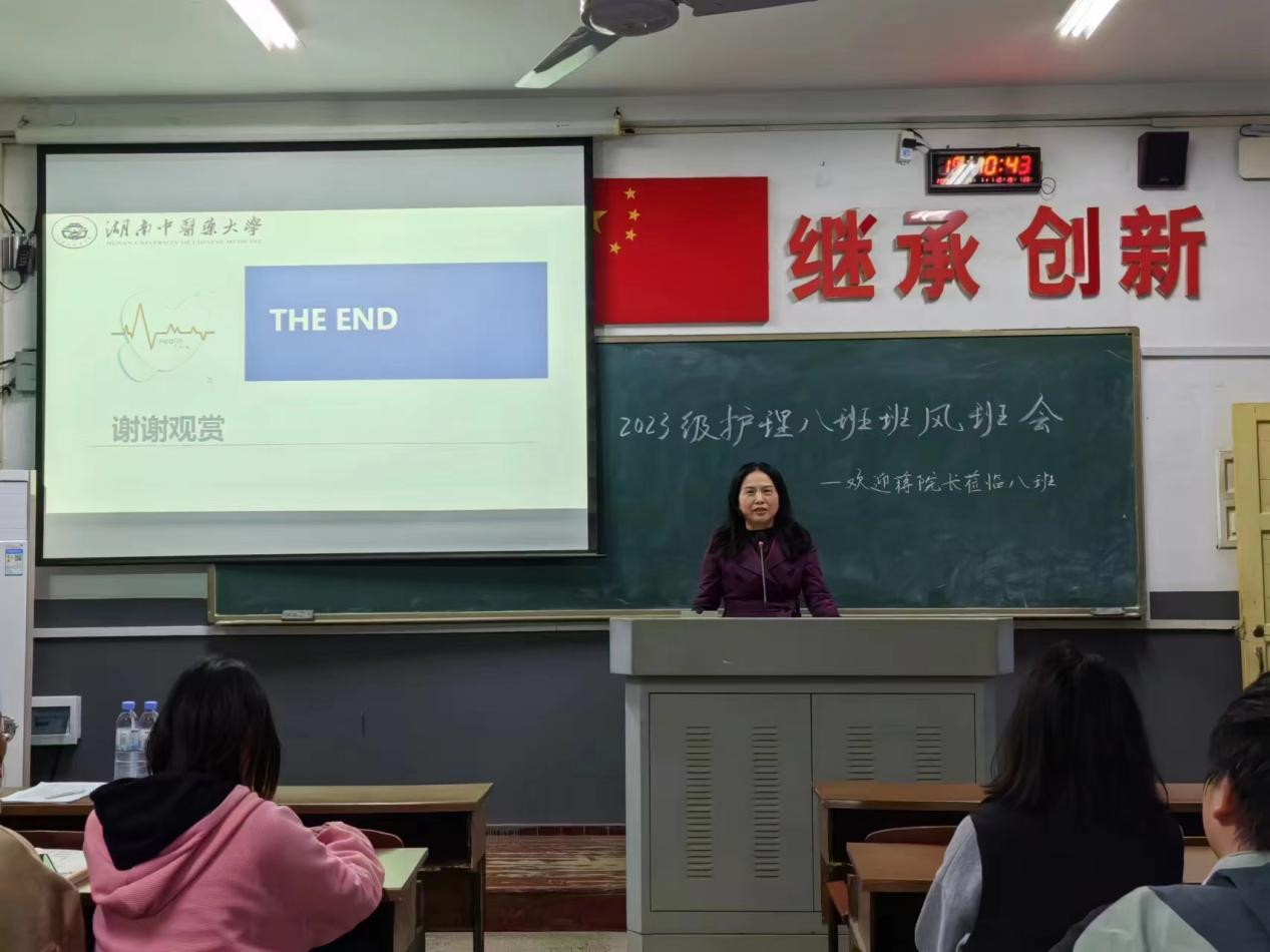11月27日,湖南中医药大学第二附属医院副院长、硕士研究生导师蒋谷芬带领研究生罗瑜来到23级护理八班,给八班学子们开展了一场意义非凡的主题班会,辅导员邹灵玥老师也参与其中,此次班会的主题是学风建设,旨在鼓励同学们在学习的道路上越战越勇,扫除现阶段关于未来学习的迷津。