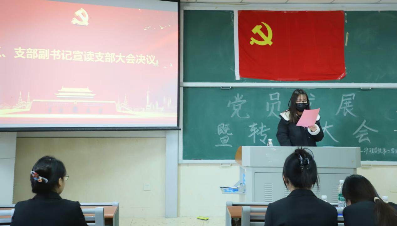 大会第二阶段为党员转正大会。首先由申请转正的彭欣怡、姜奕如等8名预备党员宣读《转正申请书》并向大会汇报了自己在预备期间的表现,包括成绩、进步以及存在的不足,并表明了改进态度和决心。陶鑫同志报告支部委员会审查意见后,与会党员进行充分讨论并发表意见。支部副书记林佳旭宣读支部大会决议:一致同意彭欣怡、姜奕如等8名同志按期转为中共正式党员。