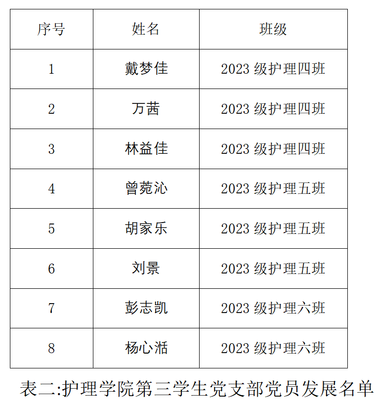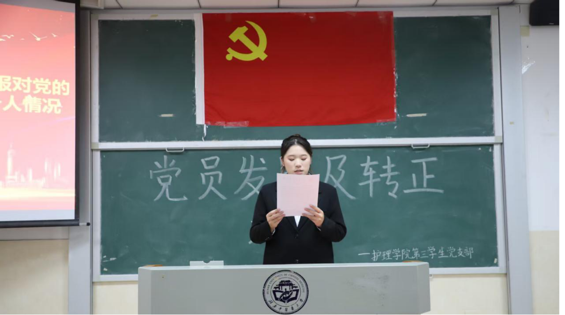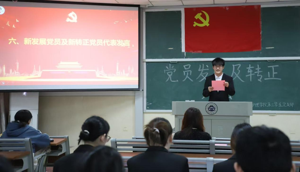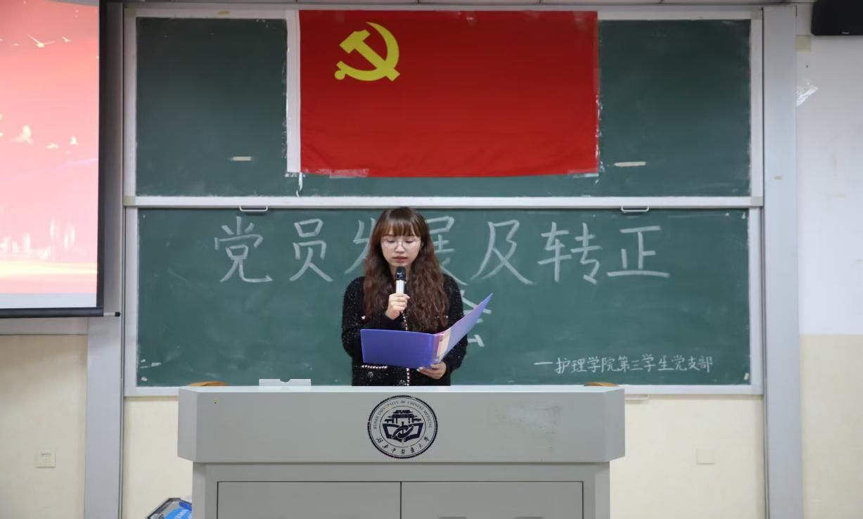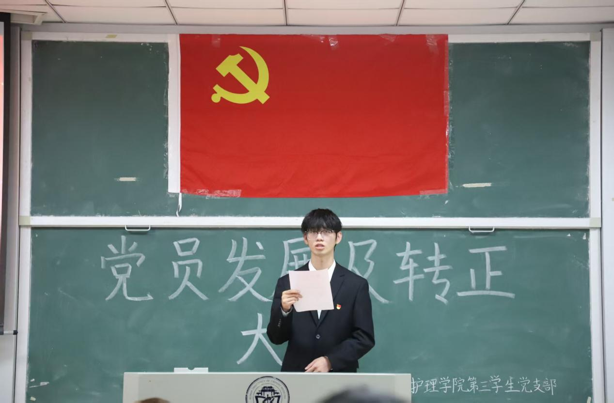 为壮大党员队伍,增强党组织凝聚力和战斗力。2025年11月30日12:10,护理学院第三学生党支部于济世楼403教室开展党员发展转正大会。本次大会主要讨论戴梦佳、万茜、林益佳、曾菀沁、胡家乐、刘景、彭志凯、杨心湉8名发展对象的入党问题及卢俊霖、方悦珲、蒋辰喜、孙佳豪、文哲5名同志按期转为中共正式党员的问题。护理学院第三学生党支部书记邹灵玥及支部全体发展对象和党员同志出席本次会议。