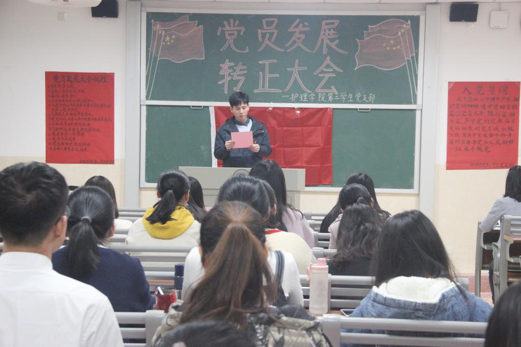 2019年11月30日下午5时,护理学院第二学生党支部于3205教室召开了支部发展转正大会。大会主要议题是讨论关于11名预备党员转正以及10名发展对象接收的问题。参加此次大会的有第二学生党支部书记李程老师、支部16、17级全体学生党员和18级发展对象。