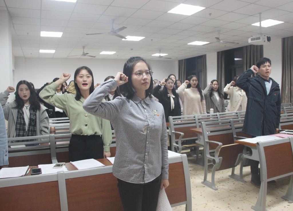 大会第一项议程,主持人秦雪清点会议人数并宣布党员到会情况。随后申请转正、发展的同志依次上台宣读自己转正或发展申请书,汇报自己预备期或考察期一年在思想、学习、工作以及生活上的感悟、收获、态度及表现。接着,支部委员会报告审查意见,经大会讨论、投票表决后,支部最终确定李芳、徐若馨等11名同志成为正式党员,符楚、杨旭龙等10名同志发展为预备党员。随后,16级党员颜慧、新发展党员杨珺雯作为代表发言,不仅表达了他们心中的喜悦,更表明了今后会更加严格要求自己、努力达到党员标准的决心。在支持人带领下,全体与会人员进行入党宣誓。最后,李程书记对大会进行总结,希望全体党员们时刻与党中央保持一致,加强党员修养,坚持为群众服务,积极发挥先锋模范作用。至此,大会圆满落幕。