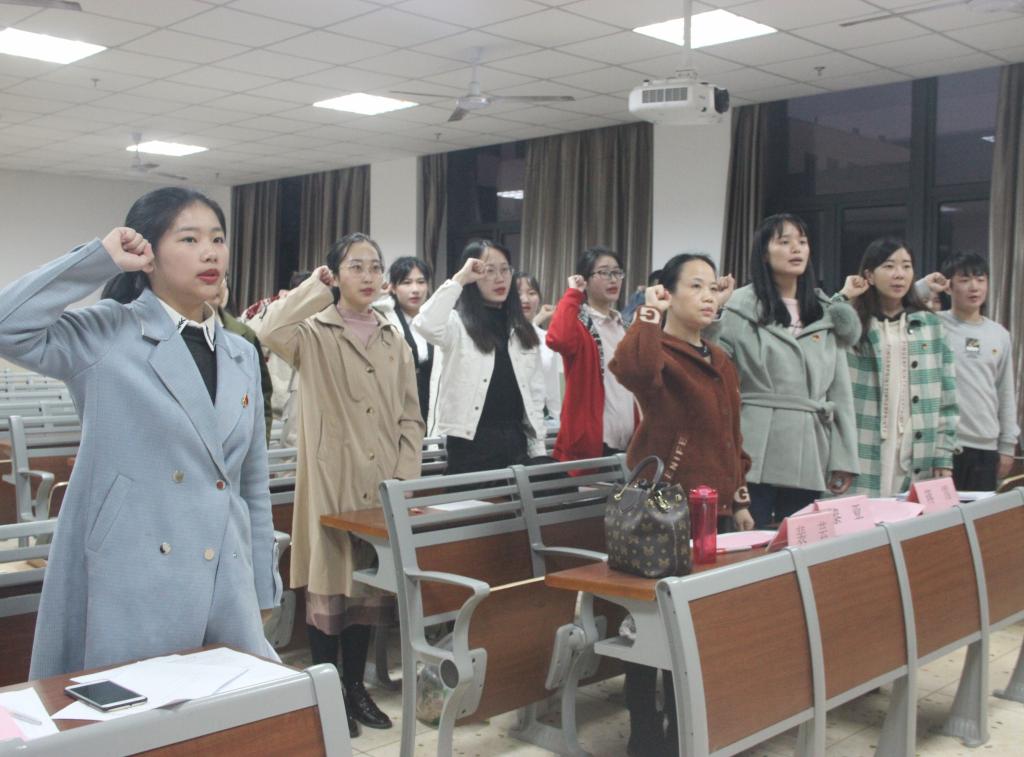 大会第一项,主持人文婷清点会议人数并宣布党员到会情况。随后,申请转正、发展的同志依次上台宣读自己的转正或发展申请书。接着入党介绍人裴芸老师宣读介绍人意见、支部委员宣读支部审查意见。随后大会进行讨论并投票票决,最终确定谢一玄、李丹、文婷等7名同志成为正式党员,黄凝、向倩、高琴等6名同志成为预备党员。之后新党员代表李丹和预备党员代表黄凝上台发言,阐述了端正入党动机的重要性以及如何以党员的标准严格要求自己,对大家有所鼓励与启发。最后,全体成员在主持人带领下宣读入党誓词。