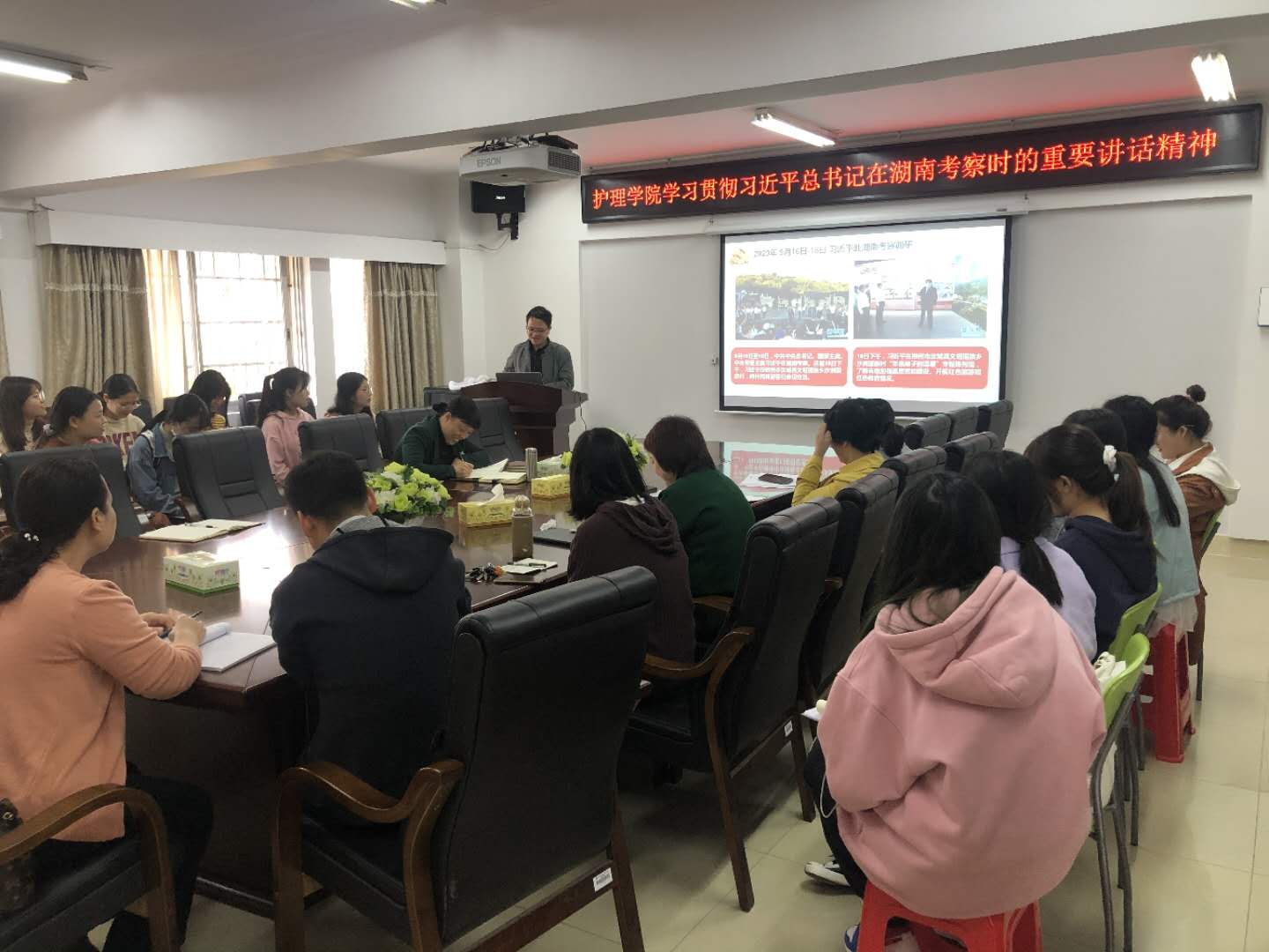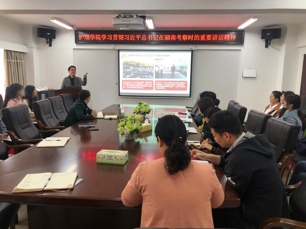 10月27日上午,为深刻领会习近平总书记考察湖南重要讲话精神,护理学院党委开展党委书记讲党课活动,院党委书记、院长罗尧岳以《深入学习贯彻习近平总书记考察湖南重要讲话精神,奋力谱写新时代中国特色社会主义湖南新篇章》为主题讲授专题党课,学院党委班子、全体党员老师、部分学生党员代表参加学习。