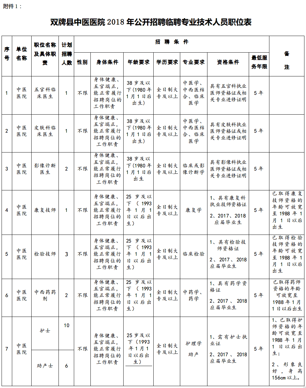 附件:1、2018年双牌县中医医院公开招聘临聘专业技术人员职位表