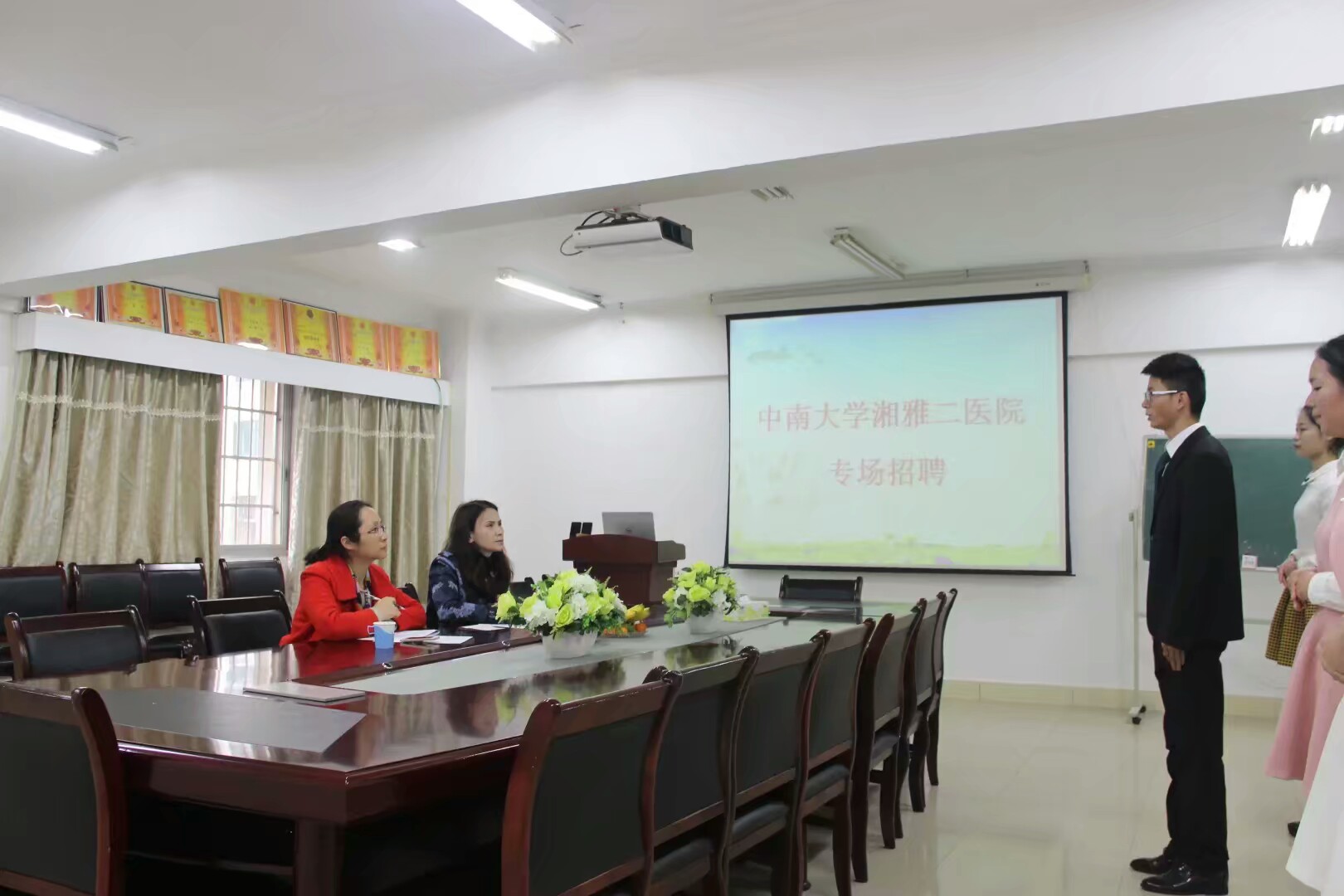 2017年1月15日上午8点半,我院在护理学院会议室举办“中南大学湘雅二医院”专场招聘会,护理学院党总支黄群副书记、学生科科长马改红老师和学生科裴芸老师等亲临现场,湘雅二医院评委老师和部分14级学生参加了本次招聘会。