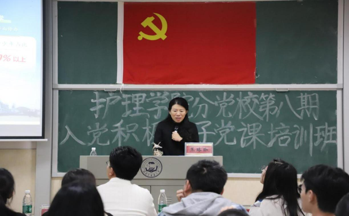 为帮助学员感悟抗战精神,庚续红色血脉。2025年10月16日19时,湖南中医药大学党委委员、组织人事部部长焦珞珈以“弘扬伟大抗战精神,书写无愧于时代的青春篇章”为主题在济世楼110教室为护理学院第八期入党积极分子授课。护理学院党委副书记李宗霖、第二学生党支部书记黄莹及入党积极分子全体成员参加学习。