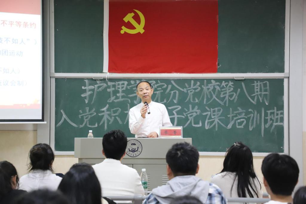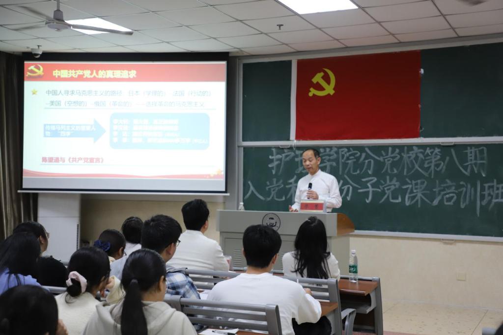 为引导入党积极分子从党的精神之源汲取奋进力量,深刻领悟中国共产党人精神谱系的源头起点,2025年10月16日晚20时,湖南中医药大学党委委员、副校长廖菁在含浦校区济世楼110教室,为护理学院第八期入党积极分子培训班讲授了一堂深刻而精彩的“弘扬伟大建党精神”主题党课。护理学院党委副书记李宗霖、学生党支部书记,以及全体入党积极分子参加学习。