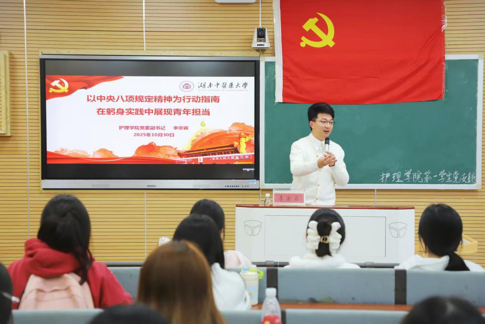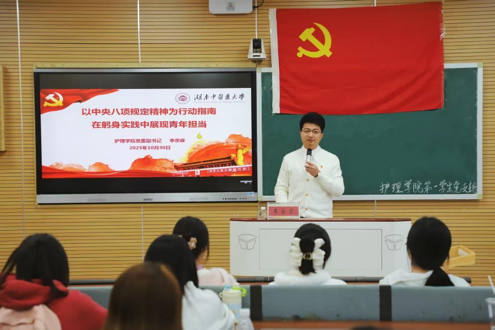 为深入贯彻落实中央八项规定精神,强化青年群体尤其是学生党支部的发展对象和预备党员的纪律意识与责任担当,2025年10月30日16时,湖南中医药大学护理学院党委副书记李宗霖在济世楼400教室开展“以中央八项规定精神为行动指南,在躬身实践中展现青年担当”主题党课,第一学生党支部全体党员参加本次学习。