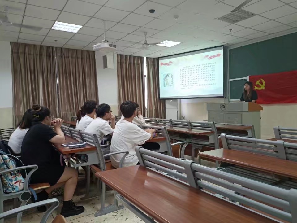 党课伊始,支部书记黄莹以毛泽东同志的诗句"我失骄阳君失柳,杨柳轻飏直上重霄九。"的诗句走进杨开慧,后为在场学生党员介绍其短暂而不凡的一生。受毛泽东同志的影响,杨开慧一直积极参与革命事业,组织领导多地的武装斗争,发展党的组织,坚持斗争整整三年。1930年,为保卫党组织,杨开慧于识字岭英勇就义,并留下死不足惜,只愿润之革命早日成功的遗言。黄莹老师的讲述让在场的每一位学生党员感受到了杨开慧作为一名共产党员所展现出来的崇高气节,大无畏的牺牲精神。