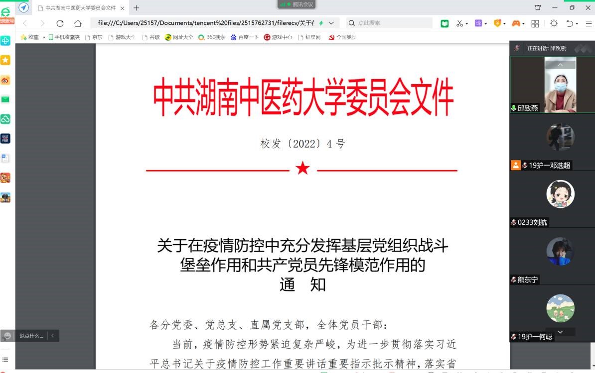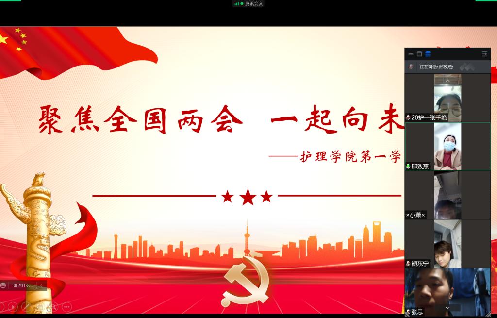 2022年3月30日下午4:30,护理学院第一学生党支部书记邱致燕带领本支部全体学生党员于腾讯会议开展本季度“聚焦全国两会,一起向未来”暨“疫情防控党员先行”主题党课学习活动。