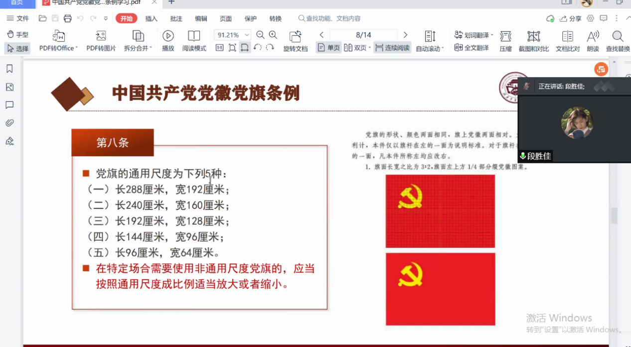党课伊始,支部书记段胜佳介绍了党徽党旗条例印发背景、条例具体内容等。
