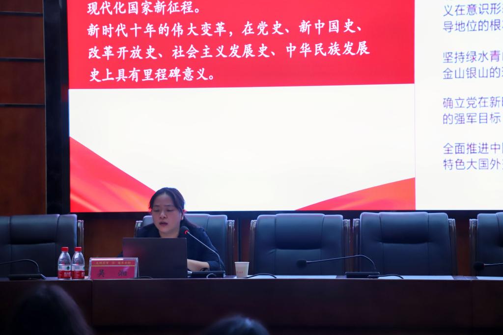 课上,吴湘副书记对党的二十大精神进行了系统的梳理和详细的解读,并结合本支部工作实际对学生党员提出了具体要求:本支部学生党员要学习二十大的重要内容和精神实质,从百年党史中汲取思想伟力,结合支部实际落实大会作出的决策部署,在实践中感悟二十大的重大意义,在实践中锤炼自身过硬本领。党课最后,米蕴智同志分享心得体会:“此次党课学习,使我加深了对二十大精神的认识和理解,增强了我的政治责任感和使命感。在未来的学习生活中一定会以二十大精神为指引,坚定理想信念,强化使命担当。”