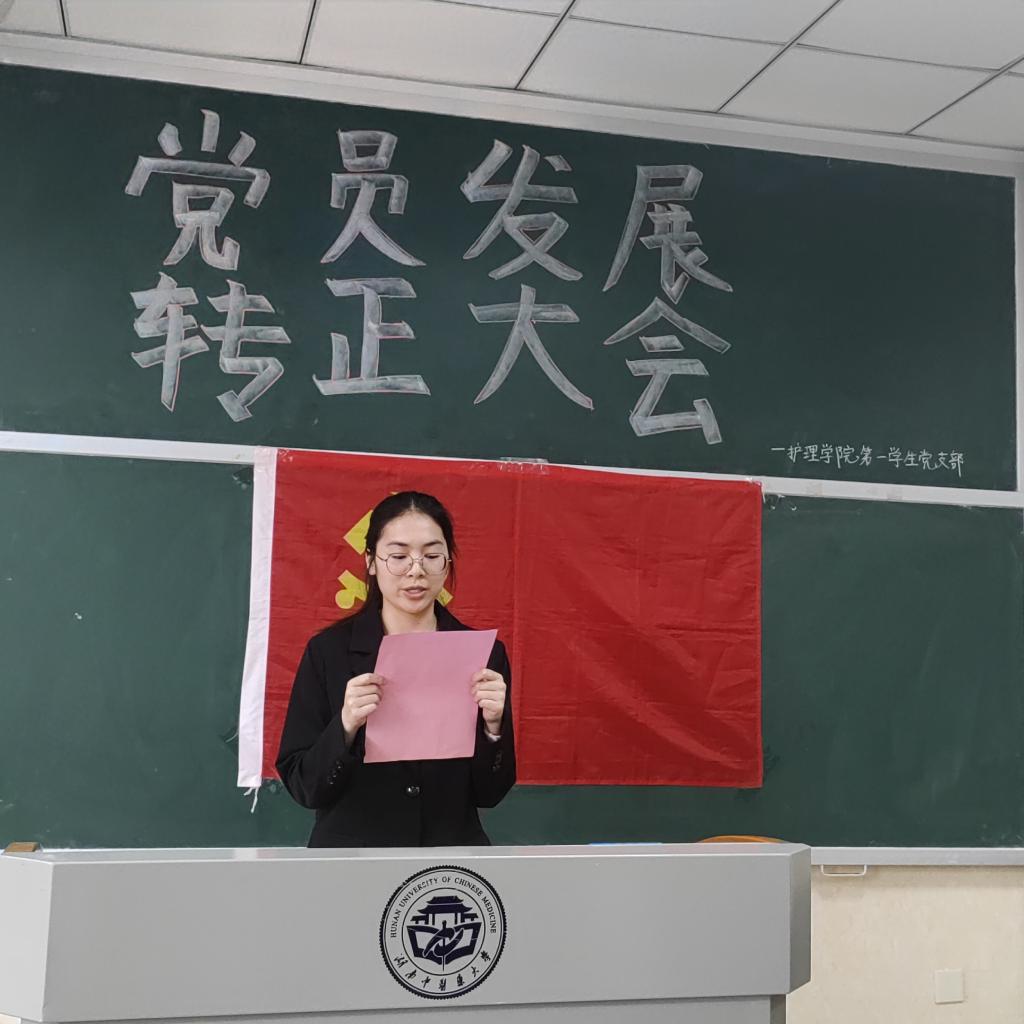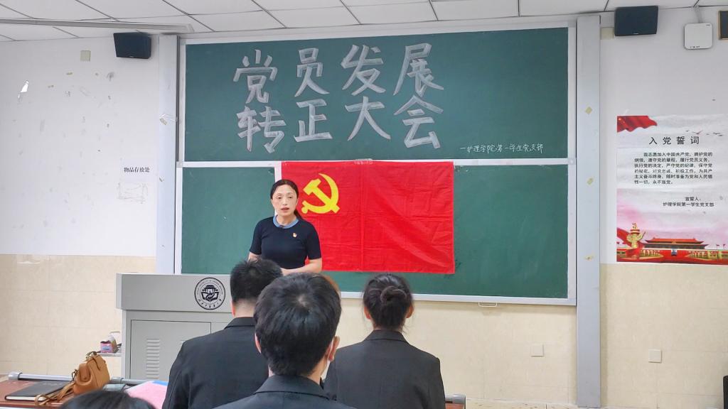 2023年5月16日下午16:30,护理学院第一学生党支部党员发展转正大会在3401教室举行。本次大会主要讨论了阳骏、李丽等17名同志的入党问题及祝申奥、曾阳等12名同学预备党员按期转为中共正式党员的问题。护理学院第一学生党支部书记邱致燕及第一支部全体在校党员参与本次会议。