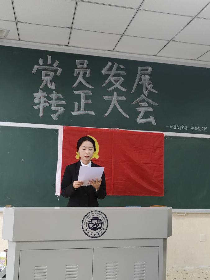 大会结束之际,学生第一党支部书记邱致燕同志作总结讲话,先对新转正党员及新发展对象表示祝贺,也同时对支部全体参会同志提出了新要求。进一步明确了党员同志要有吃苦在前享乐在后的意识,自觉维护好党和党员的形象的信念,主动发挥党员的先锋模范作用,切实提升自己,进而潜移默化带动身边的人,为构建和谐社会而不懈努力。