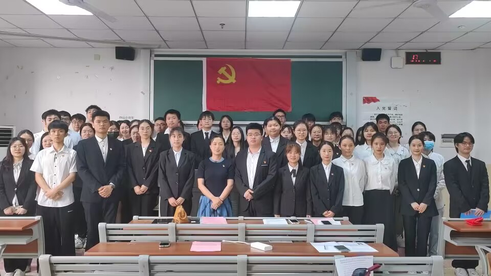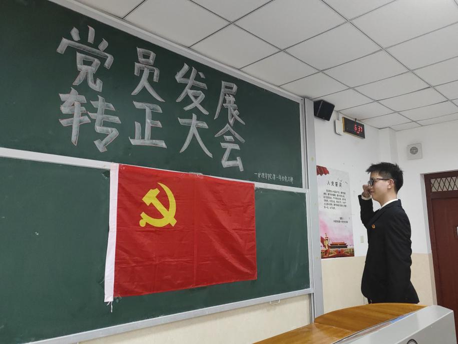 大会伊始,主持人王思颖清点会议人数并宣布党员到会情况。全体与会人员起立,本次大会在慷慨激扬的《国际歌》歌声中正式开始。首先,进行大会第一阶段:党员发展大会。本批17名发展对象依次上台宣读《入党志愿书》并汇报个人基本情况、入党动机等。待全体发展对象宣读完毕后,由张千艳同志介绍发展对象的有关情况和对其入党意见,支部委员会代表米蕴智同志宣读支部审查意见。随后支部全体参会党员进行讨论并投票票决。支部书记邱致燕宣读支部决议。紧接着,全体同志起立,高举右拳,面向党旗立下铿锵誓言。张汉亮同志代表全体新发展对象发言,表明自身应肩负的责任担当,同时要保持清正廉洁的正义之气,时刻遵循“自重、自省、自警”的规范,善于于危机中寻找转机,在变局中开发新局,日后要愈加积极主动地吸收并学习前人经验,以正式党员的标准严格要求自己。