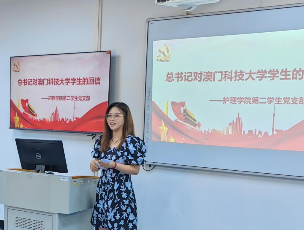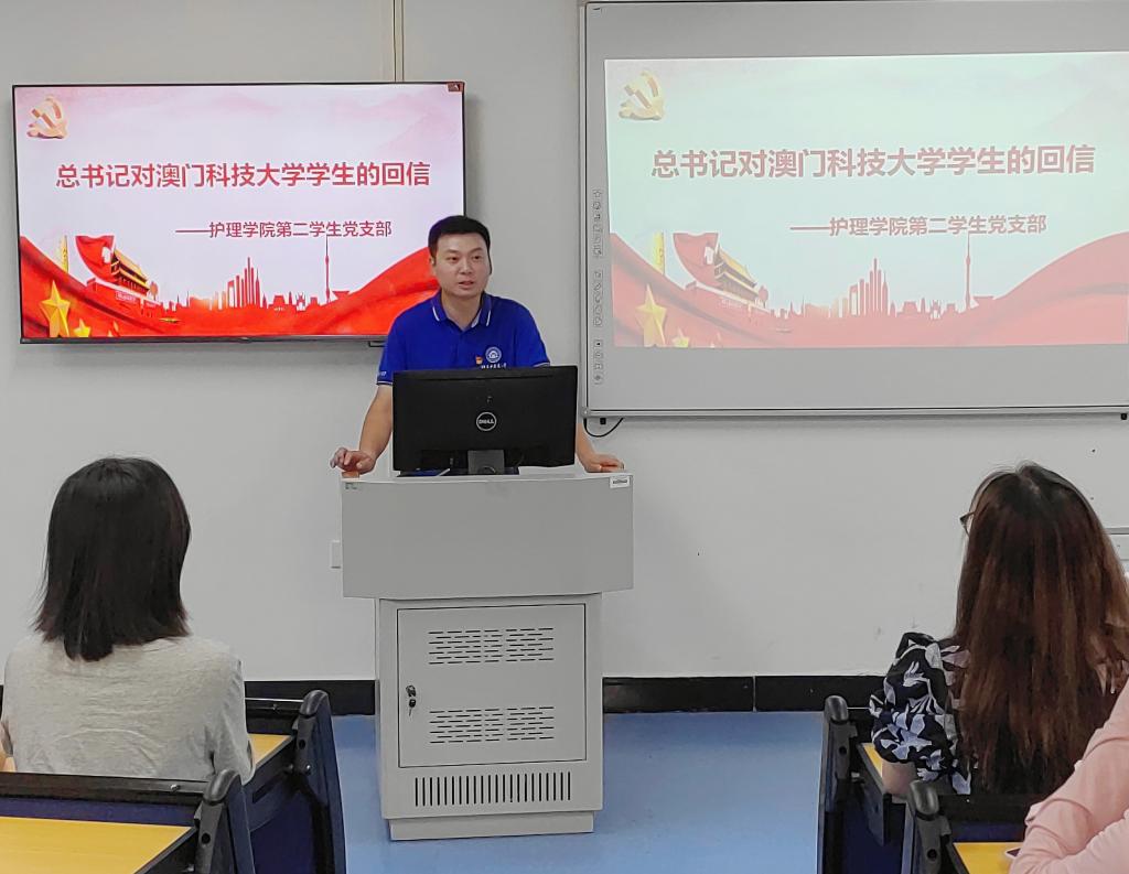 为了贯彻落实国家科技强国的战略部署,激发青年学生的创新热情。2023年6月9日9:30,护理学院第二学生党支部学习“总书记对澳门科技大学学生的回信”主题党课于B栋实验楼3楼示教室召开。本次党课由湖南中医药大学护理学院党委委员、护理学院科教科科长陈红涛同志主讲,护理学院第二学生党支部副书记林佳旭出席本次主题党课,参与听讲的为21级在校党员及21、22级入党积极分子。