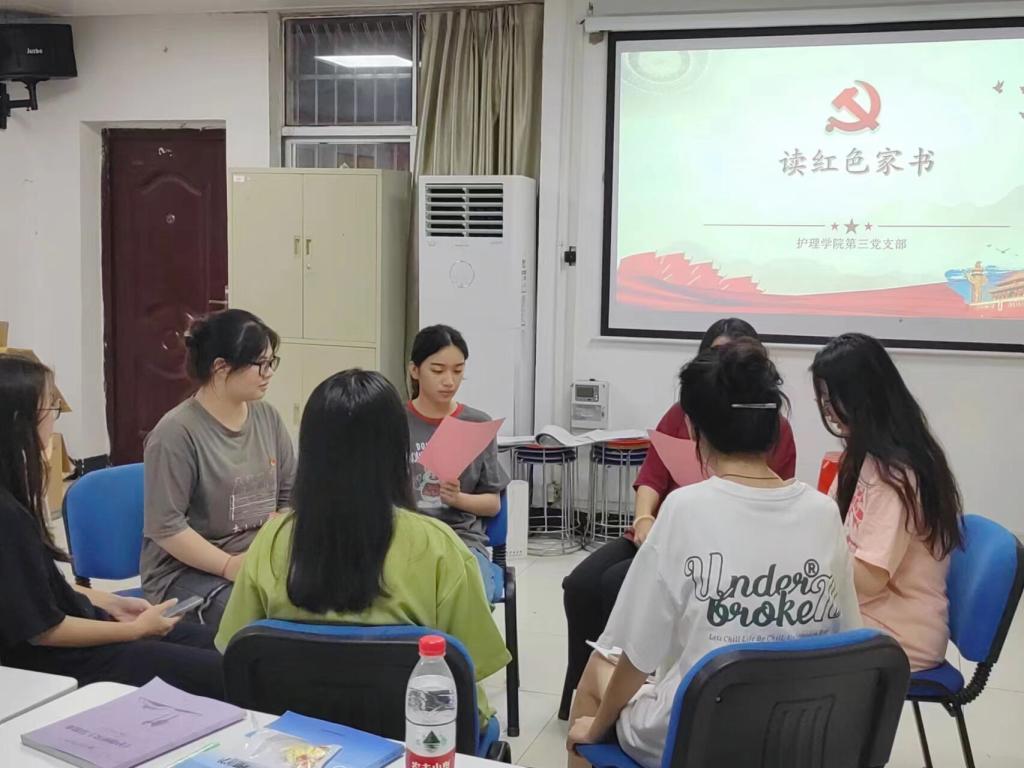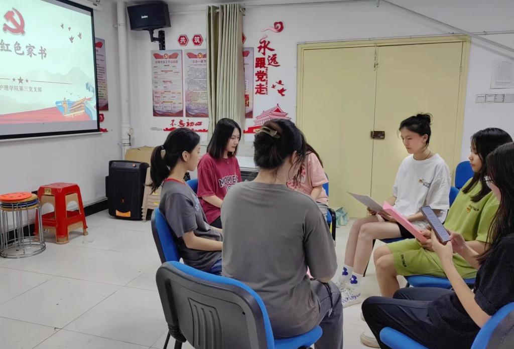 习近平总书记指出,一代人有一代人的际遇,一代人有一代人的使命,为重温革命历史、缅怀革命先烈,丰厚红色滋养,传承红色基因,2023年7月1日下午17:00,护理学院第三学生党支部于十六栋会议室开展“读红色家书,讲红色故事”主题党日活动。护理学院第三学生党支部代理支委张鑫鑫与2021级学生党员参与本次党日活动。