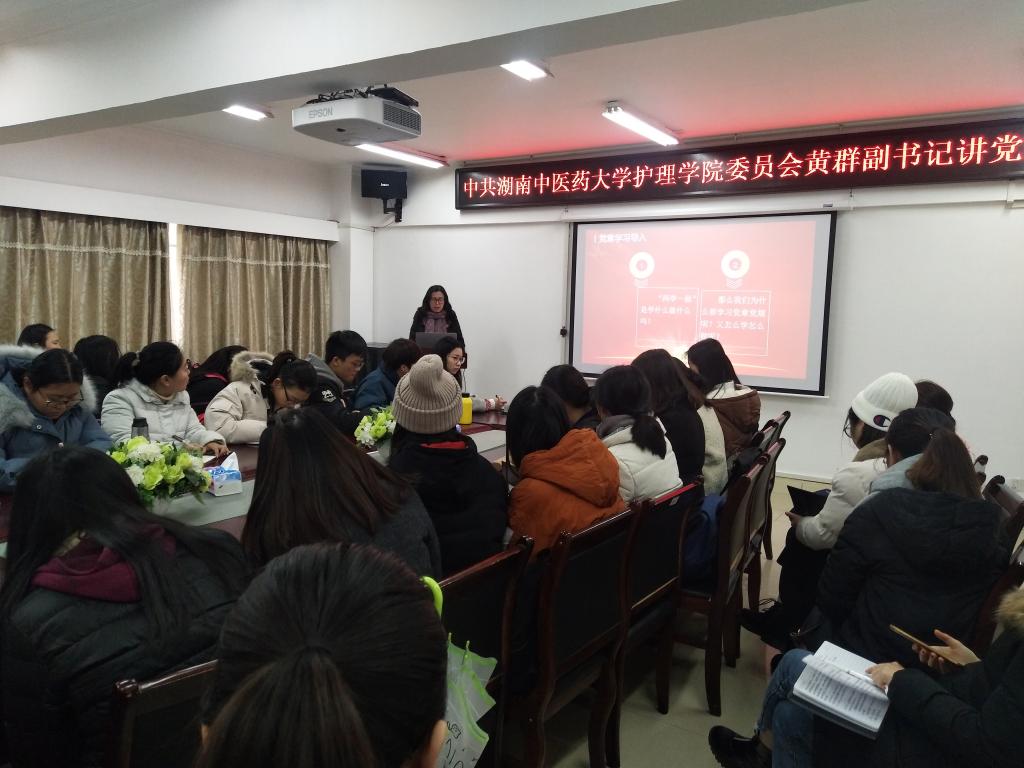 2018年12月10日中午12:30,护理学院党委副书记黄群面对学院全体在校学生党员,于学院会议室讲授了一堂“学习新党章,树立新形象”的主题党课。