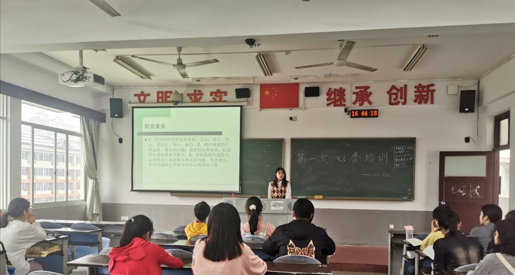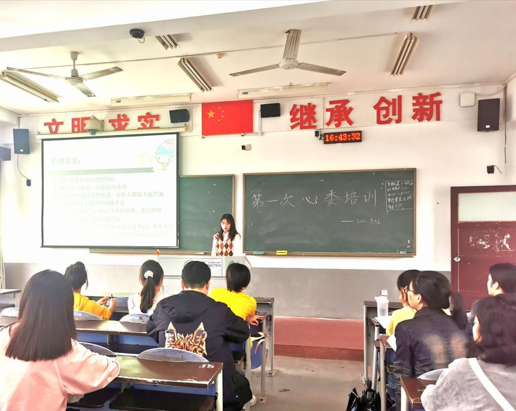 2020年9月25日下午四点半,心理专干黄莹老师在1504教室对心理委员进行了培训,参与培训的人员有18、19级各班的心理委员与副班长。培训内容主要为教会心理委员如何识别心理异常的同学,并且在得知同学心理异常后该采取什么措施。此次培训比较成功,取得的效果显著。心理委员与副班长在培训过程中非常认真,希望今后在心理健康服务部成员与心理委员的努力下营造一个健康的心理环境。