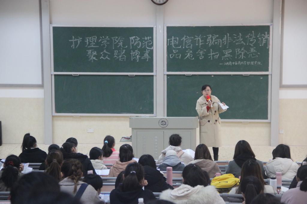 2019年12月4号12:30,为加强学生安全教育知识,提升安全防范意识,湖南中医药大学护理学院于3116教室开展了安全教育活动,此次活动主要围绕防范电信诈骗、非法传销、聚众赌博、毒品危害、扫黑除恶五大板块展开。主讲人为我院学生科科长马改红老师、学生科邱致燕老师,17级、18级、19级各班班长,生活委员以及寝室长参与活动。
