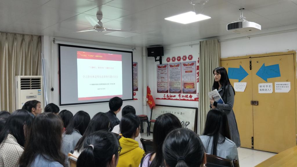 专题讨论会开始,邱致燕书记紧扣“立德树人,教育为民”的主题思想进行讲话,向学生党员们介绍了84岁离休老教师唐木林女士捐赠百万现金资助贫困学生的先进事迹。随后,李程书记结合唐木林老师的先进事迹以及其他重要学习内容鼓励学生党员应向唐木林老师学习,从身边小事做起,积极发挥模范精神,同时发布全体党员做好事挑战任务。接着,黎亚书记对全体党员提出殷切希望,愿大家能够对唐木林老师的事迹有所感触,引起反思,牢记党员身份,推己及人,始终做到集体利益在个人利益之前,自觉履行党员义务,不忘初心、牢记使命。会议最后,全体成员进行激烈讨论,其中谢一玄、戴薇同志、李宏等同志积极发言,分别分享了自己听取唐木林老师先进事迹后的心得体会。