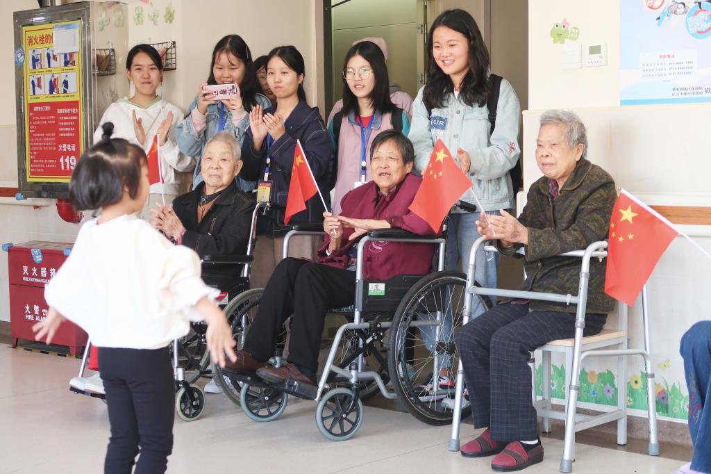 在福利院负责同志带领下,老师及学生党员们先后参观福利院三楼临终关怀区和四楼的老年病区,亲切慰问福利院老人,在了解老人日常生活及身体情况后,党员们迅速投入服务老人的工作中,给老人们按肩膀、洗水果、唱歌,做力所能及的事情。随后,学生党员们在四楼活动大厅进行了一次集中节目汇演,《没有共产党就没有新中国》、《我和我的祖国》、《五星红旗》等充满力量的歌曲、小朋友可爱灵动的舞蹈、动听悦耳的吉他演奏、轻松有趣的小游戏,都给现场老人带去了快乐,每个人脸上洋溢着幸福的笑容。最后,全体党员与老人们合影留念,也为本次的活动画上圆满的句号。
