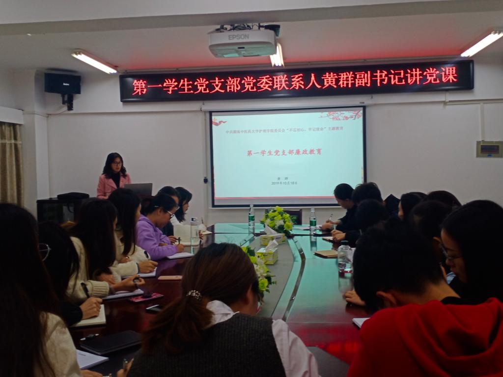 10月18日下午3时40分,为深入推进我院的廉政教育工作,第一学生支部在护理学院会议室特别召开“不忘初心、牢记使命”主题廉政党课。本次党课由护理学院党委黄群副书记主讲,第一学生支部书记邱致燕同志、支部全体党员学生参加学习。