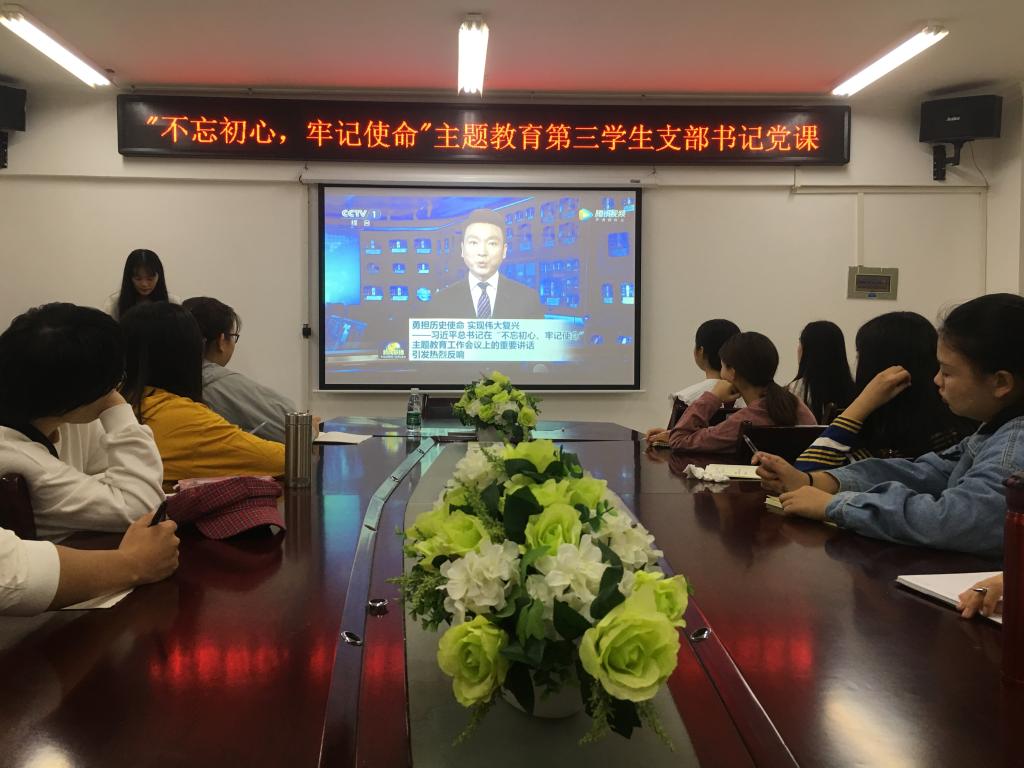 党课开始,全体成员观看习近平总书记在“不忘初心,牢记使命”主题教育工作会议上重要讲话视频。